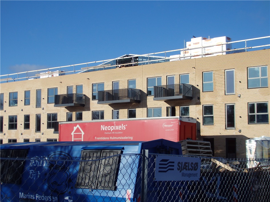 Billeder fra dagens gå tur i det flotte vejr. Taget over vinterhaven er næsten helt færdigt, og de er begyndt at sætte glas på den lille gavl side. Der er også sat nogle altaner på Vest og syd siden.
