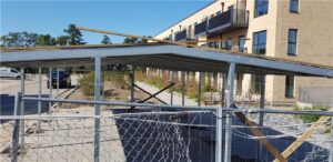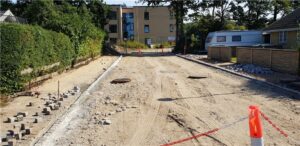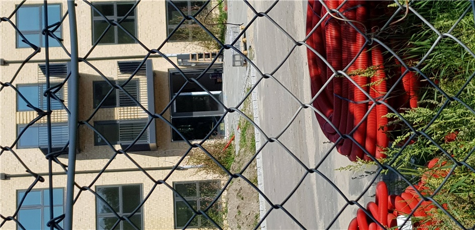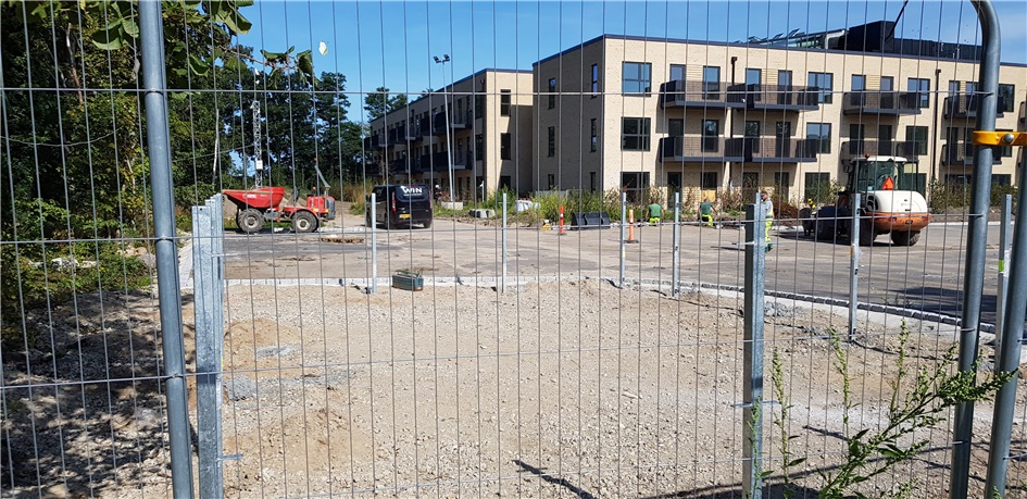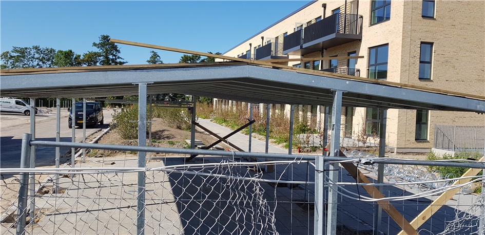 Så sker der igen noget ude foran bygningerne. De er igang med at lave indkørsel til parkeringspladsen Stolper til affaldsdepotet – cykelskuret begynder at tage form,